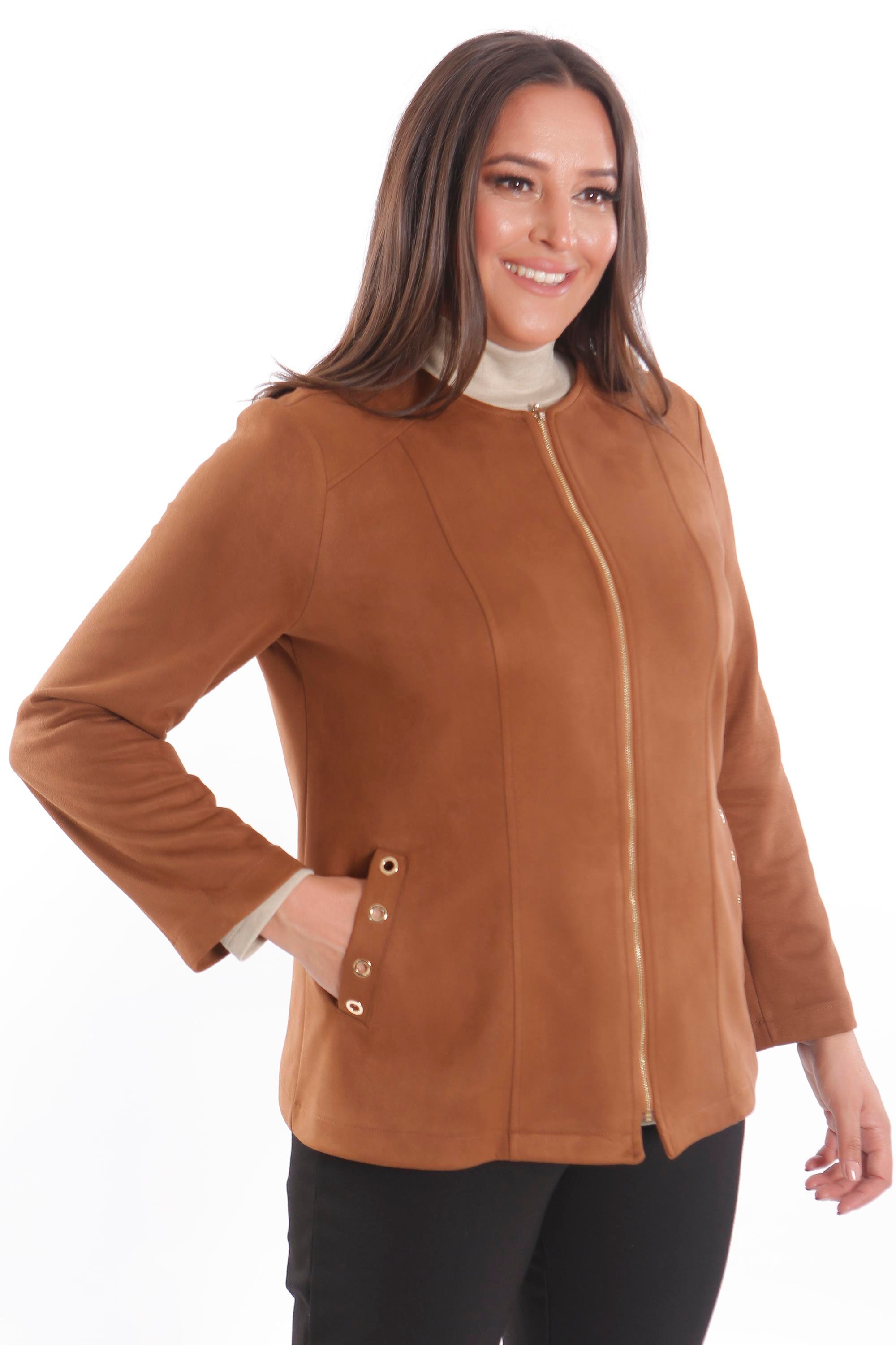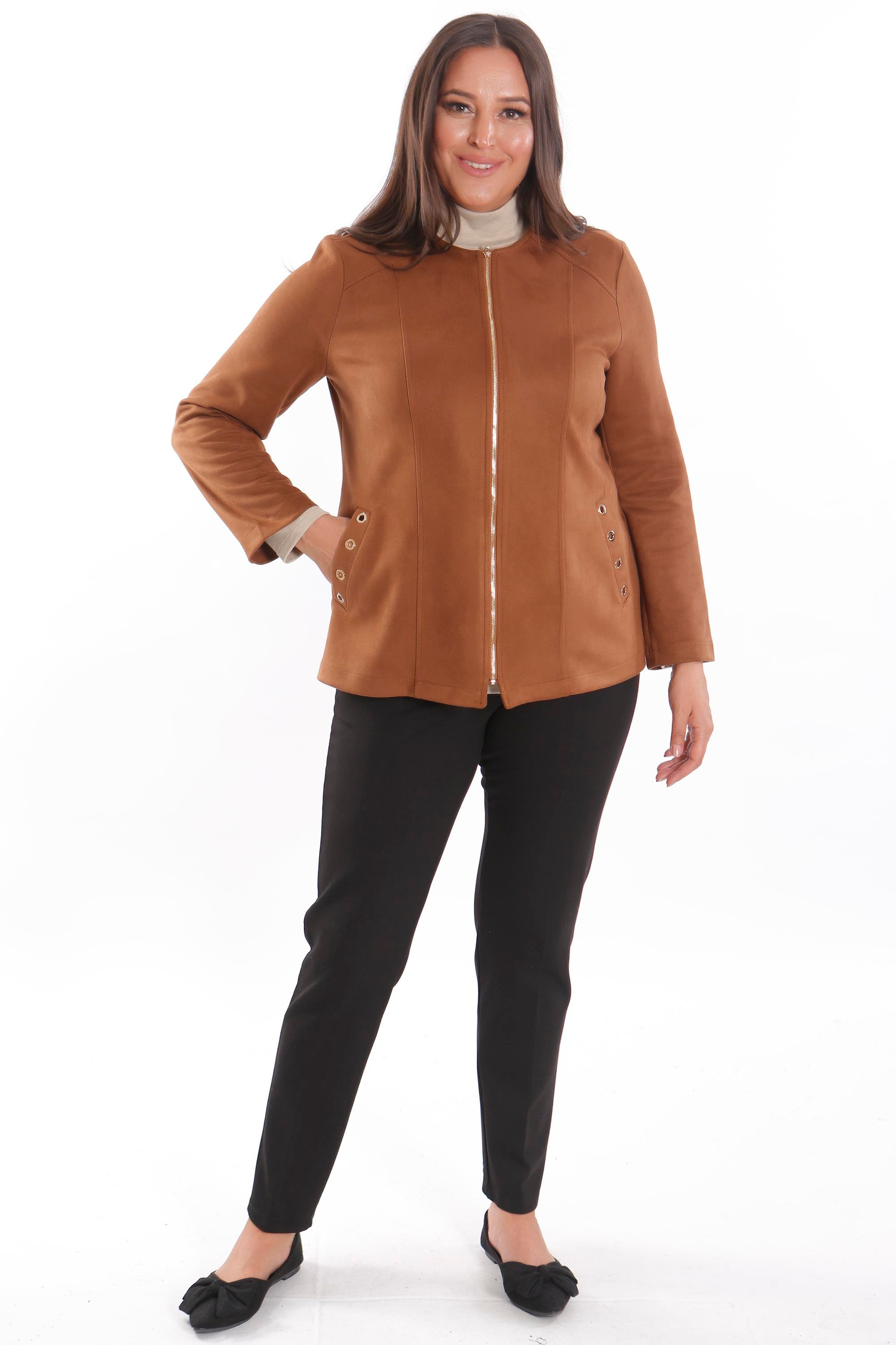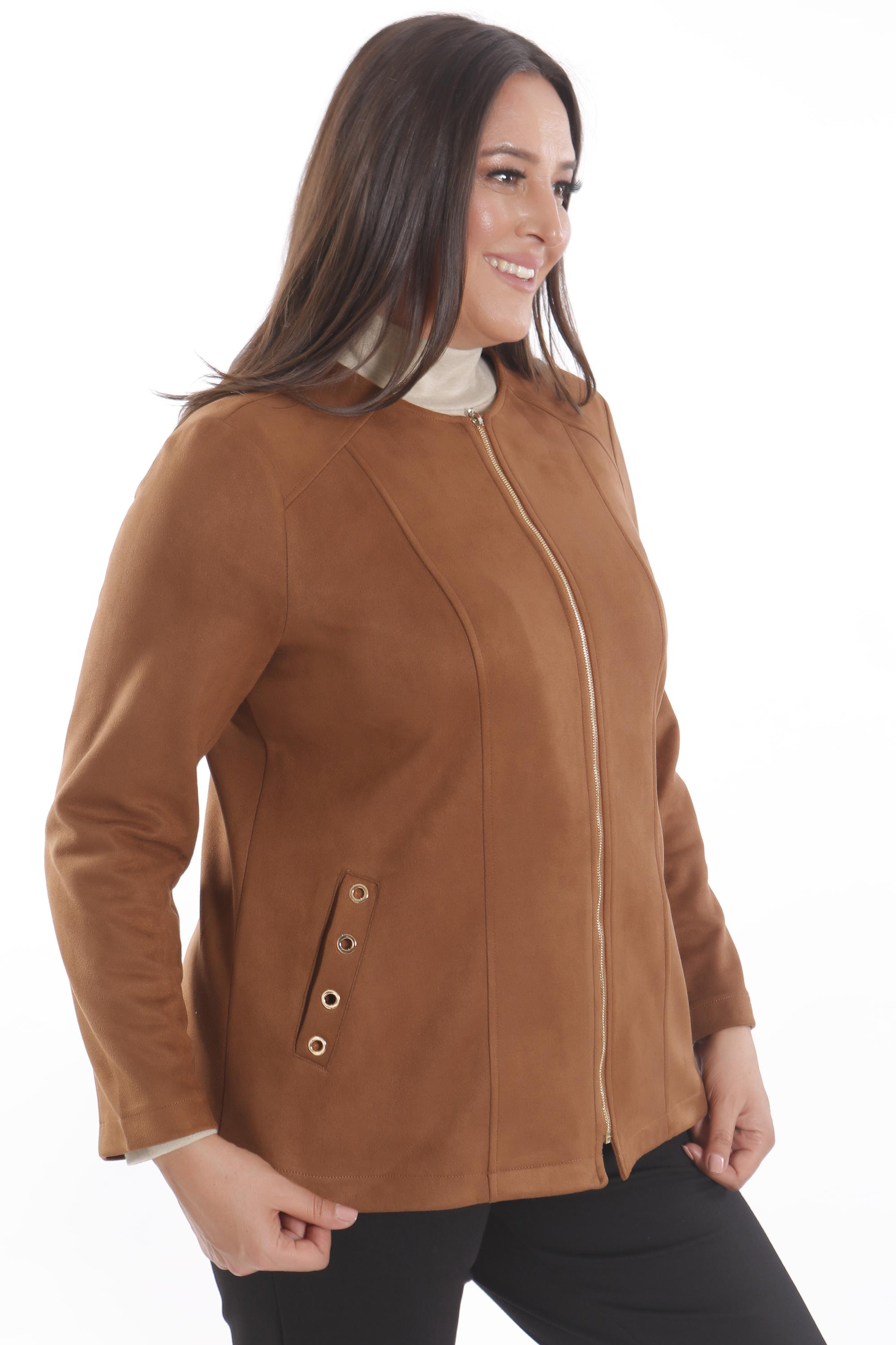 Süet malzemeden üretilen, yumuşak dokusu ile dikkat çeken süet ceket, rahatlığı ile günlük yaşamın ayrılmaz parçası.Kuş gözü cep detayı ile şık bir tasarım.Bluz,gömlek,pantolon ve eteklerinizle rahatlıkla kombinleye bileceğiniz fermuarlı kahverengi süet ceket.