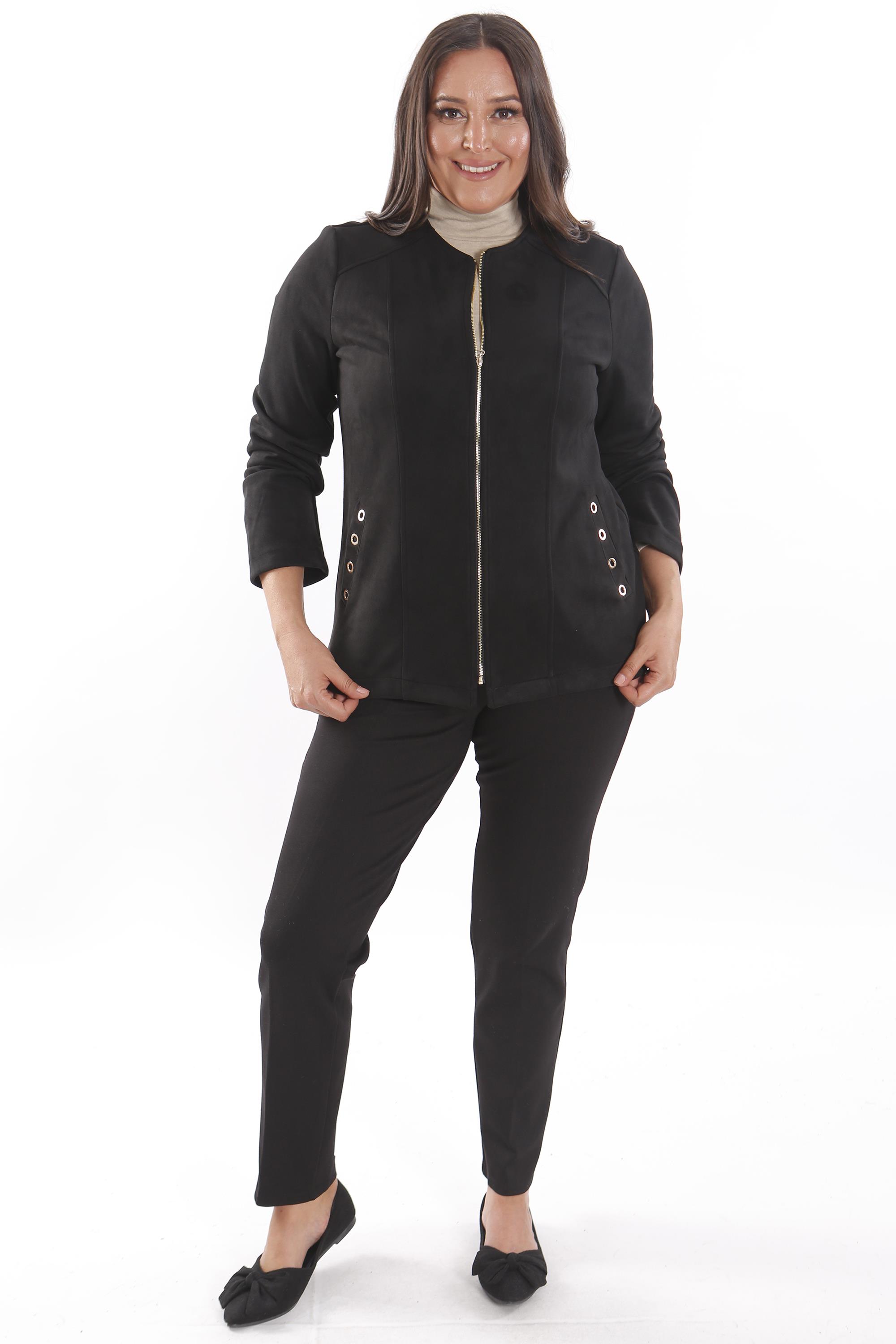 Süet malzemeden üretilen, yumuşak dokusu ile dikkat çeken süet ceket, rahatlığı ile günlük yaşamın ayrılmaz parçası.Kuş gözü cep detayı ile şık bir tasarım.Bluz,gömlek,pantolon ve eteklerinizle rahatlıkla kombinleye bileceğiniz fermuarlı siyah süet ceket.
