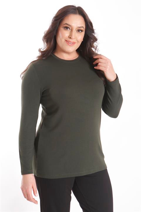 Trend42plus büyük Beden Basic Bisiklet Yaka Haki Bluz (20709)