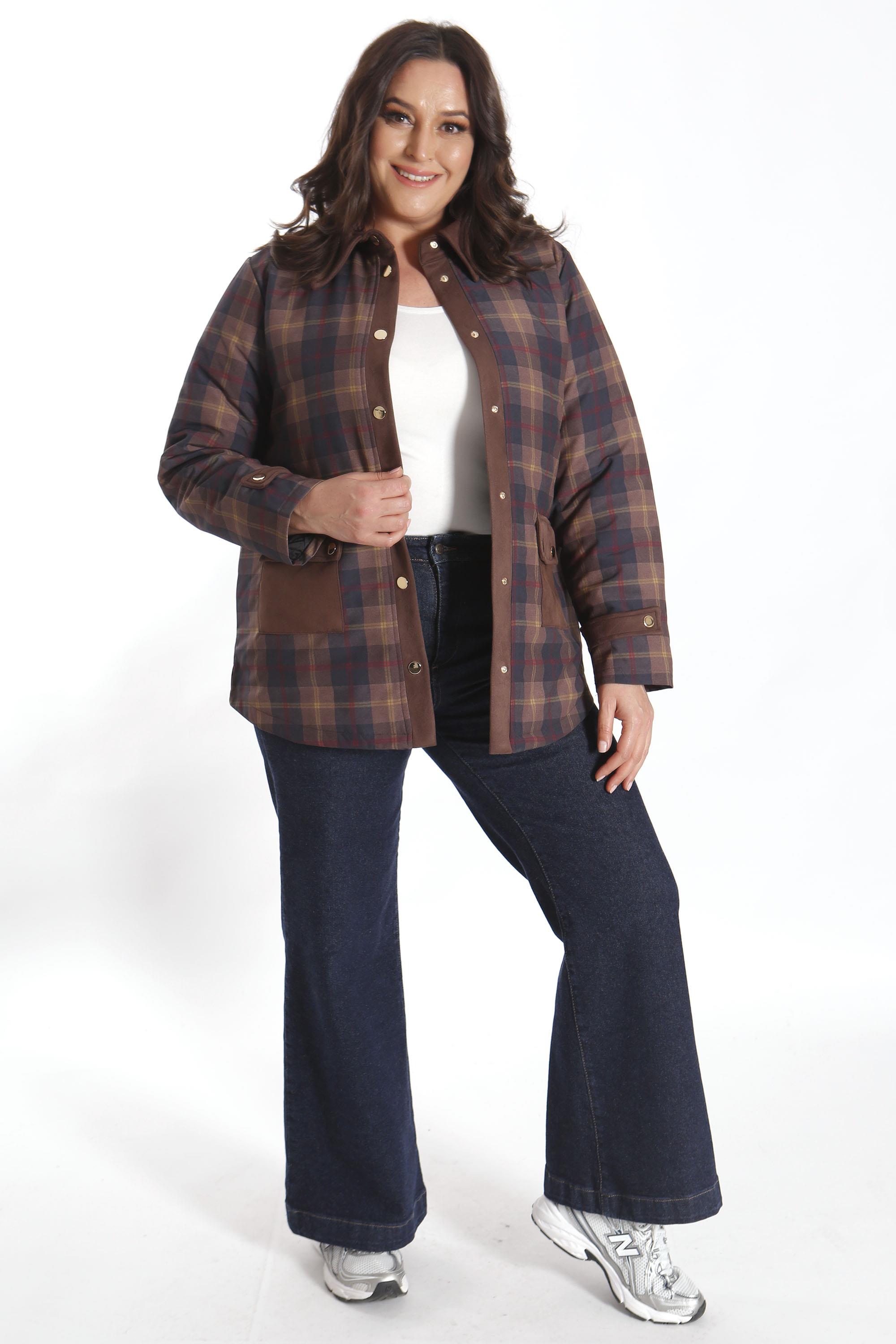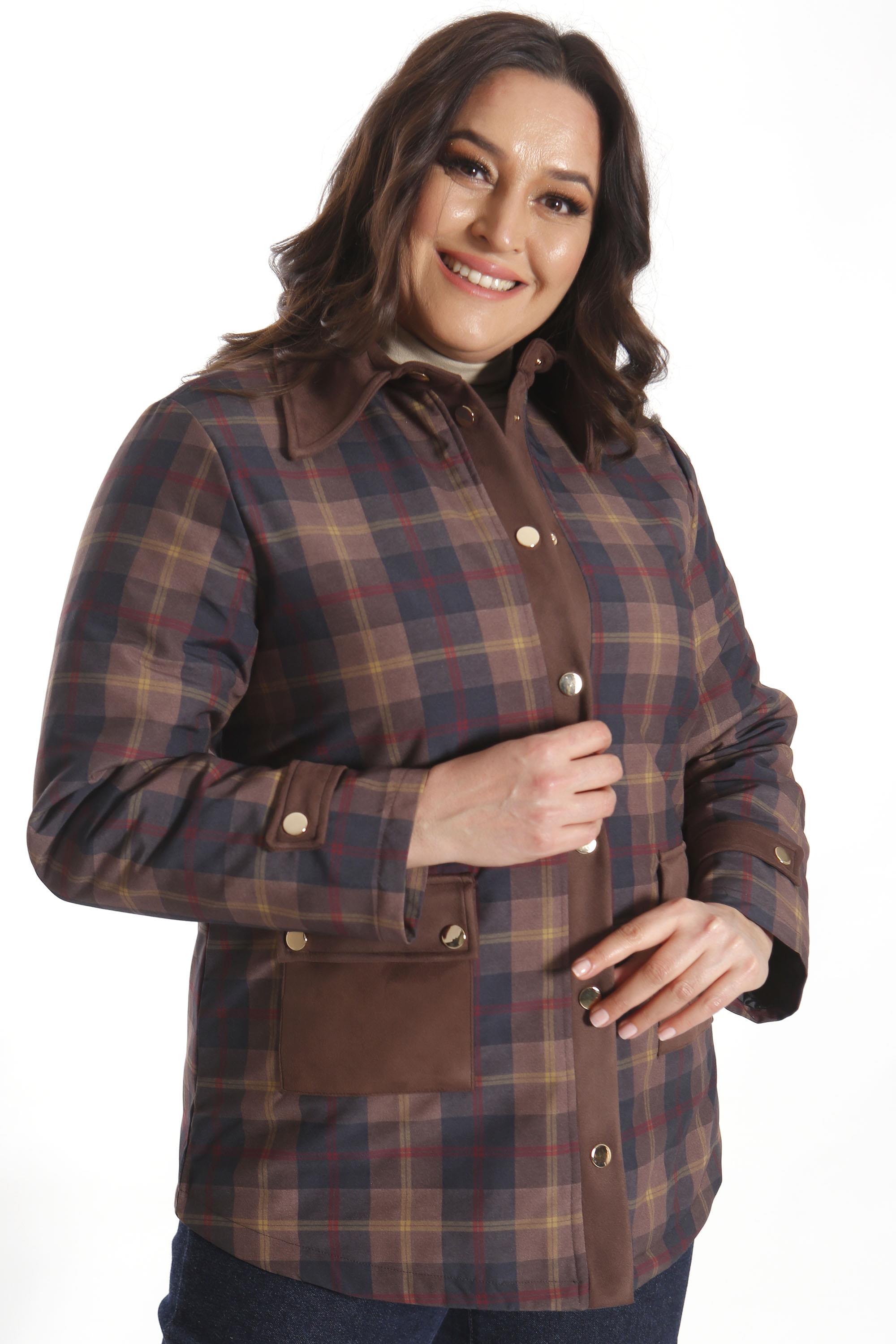 Trend42plus Büyük Beden Çıt Çıt Düğmeli Ekose Desenli Kahverengi Mont (90007)