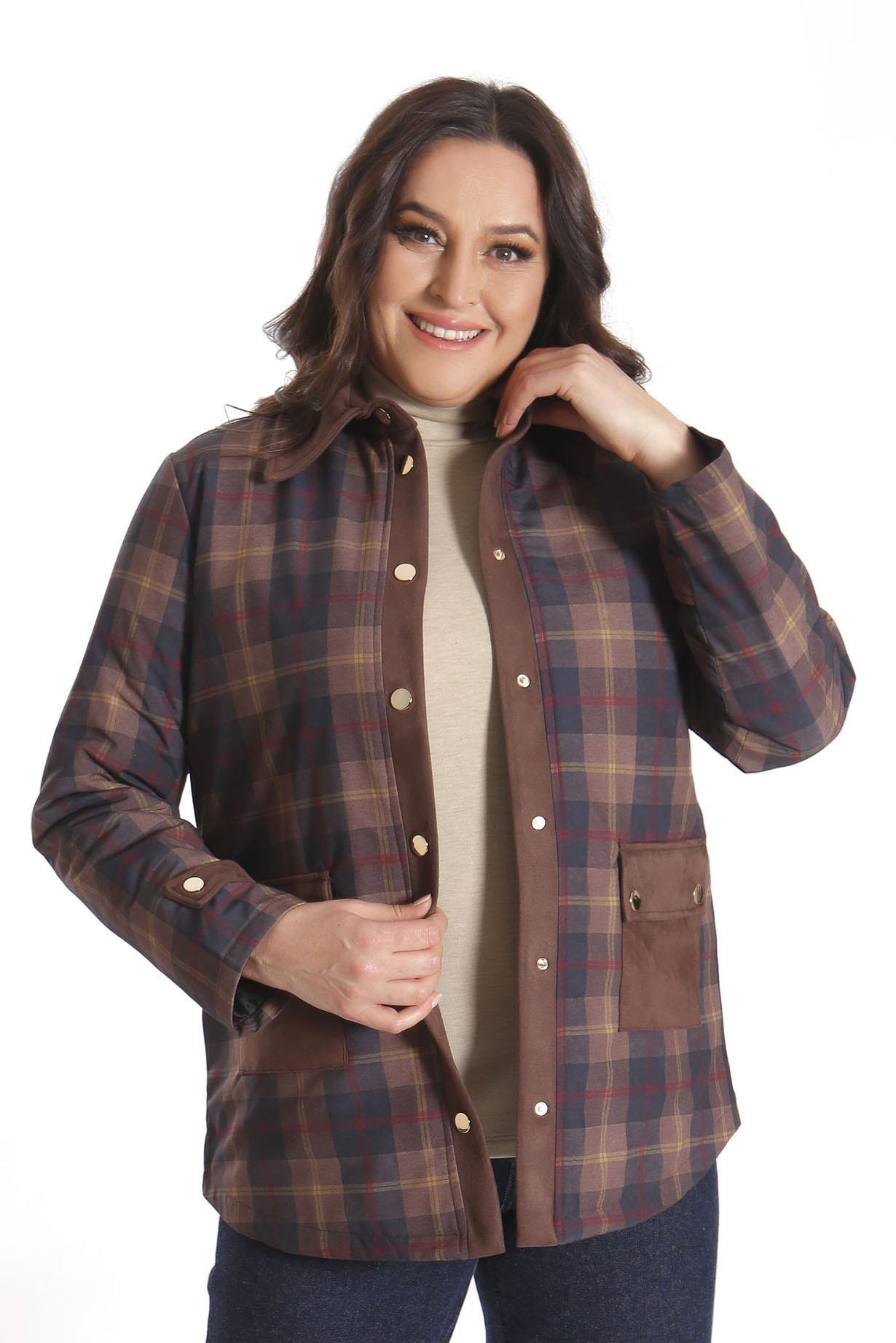 Trend42plus Büyük Beden Çıt Çıt Düğmeli Ekose Desenli Kahverengi Mont