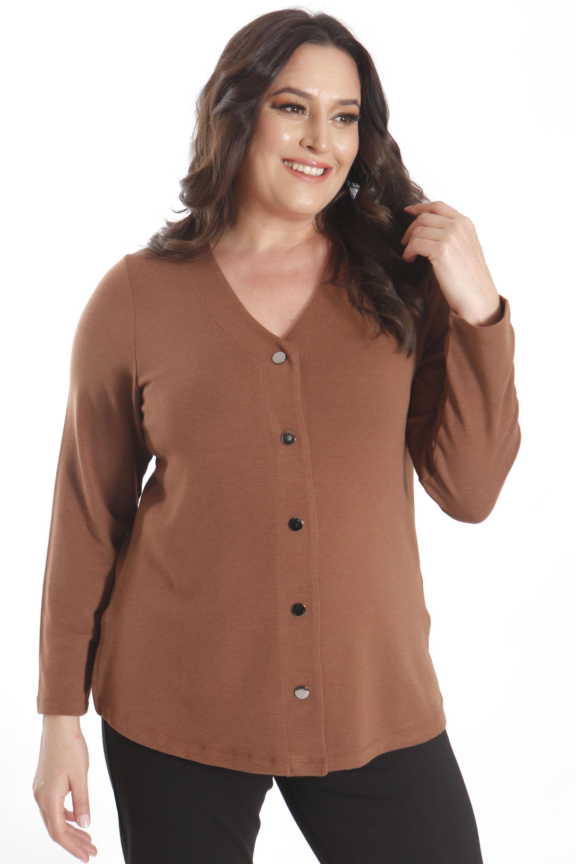 Trend42plus Büyük Beden Çıt Çıt Düğmeli Kahverengi Hırka