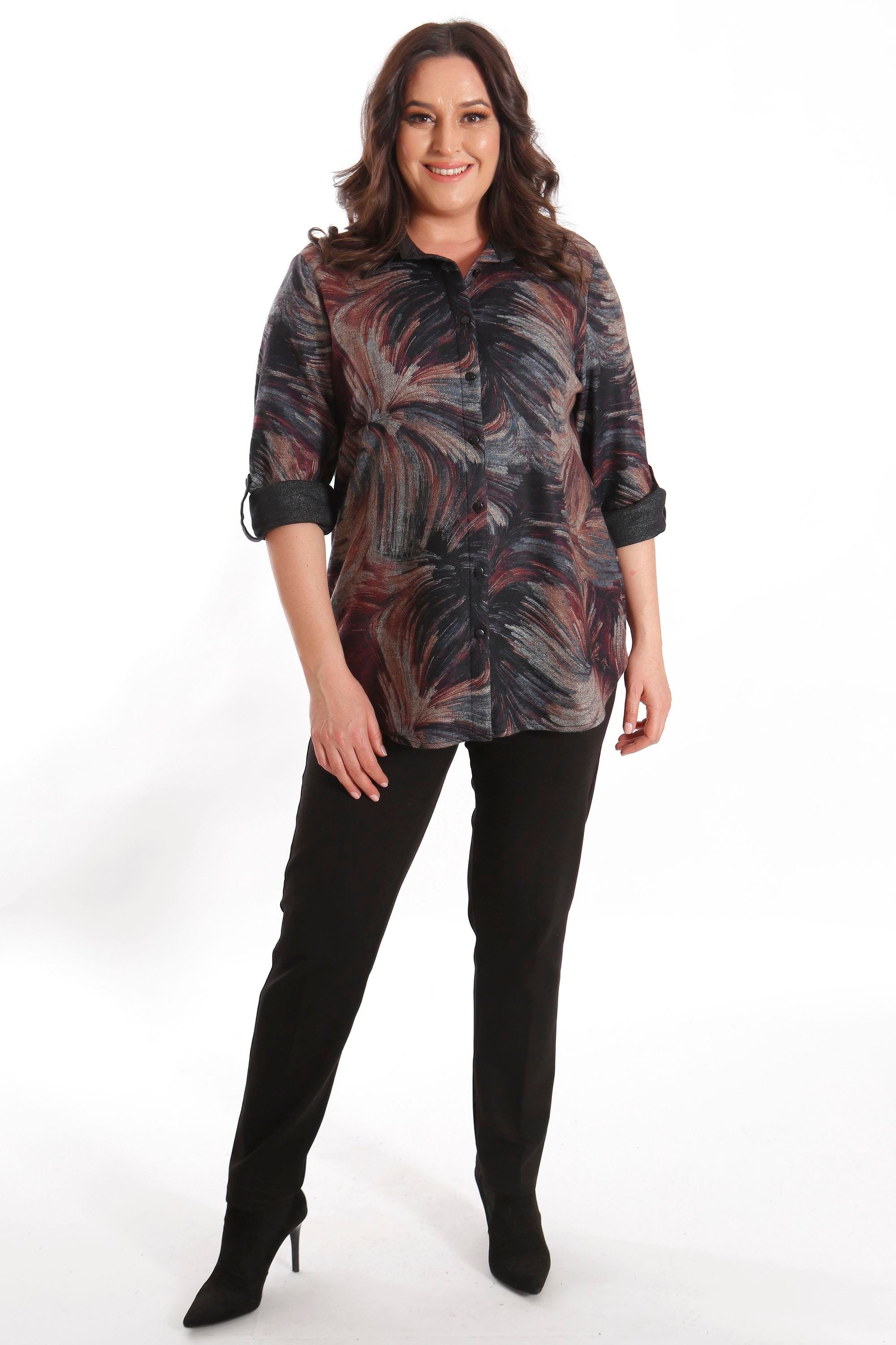 Trend42plus Büyük Beden Dijital Baskılı Deri Yakalı Mürdüm Gömlek (10674)