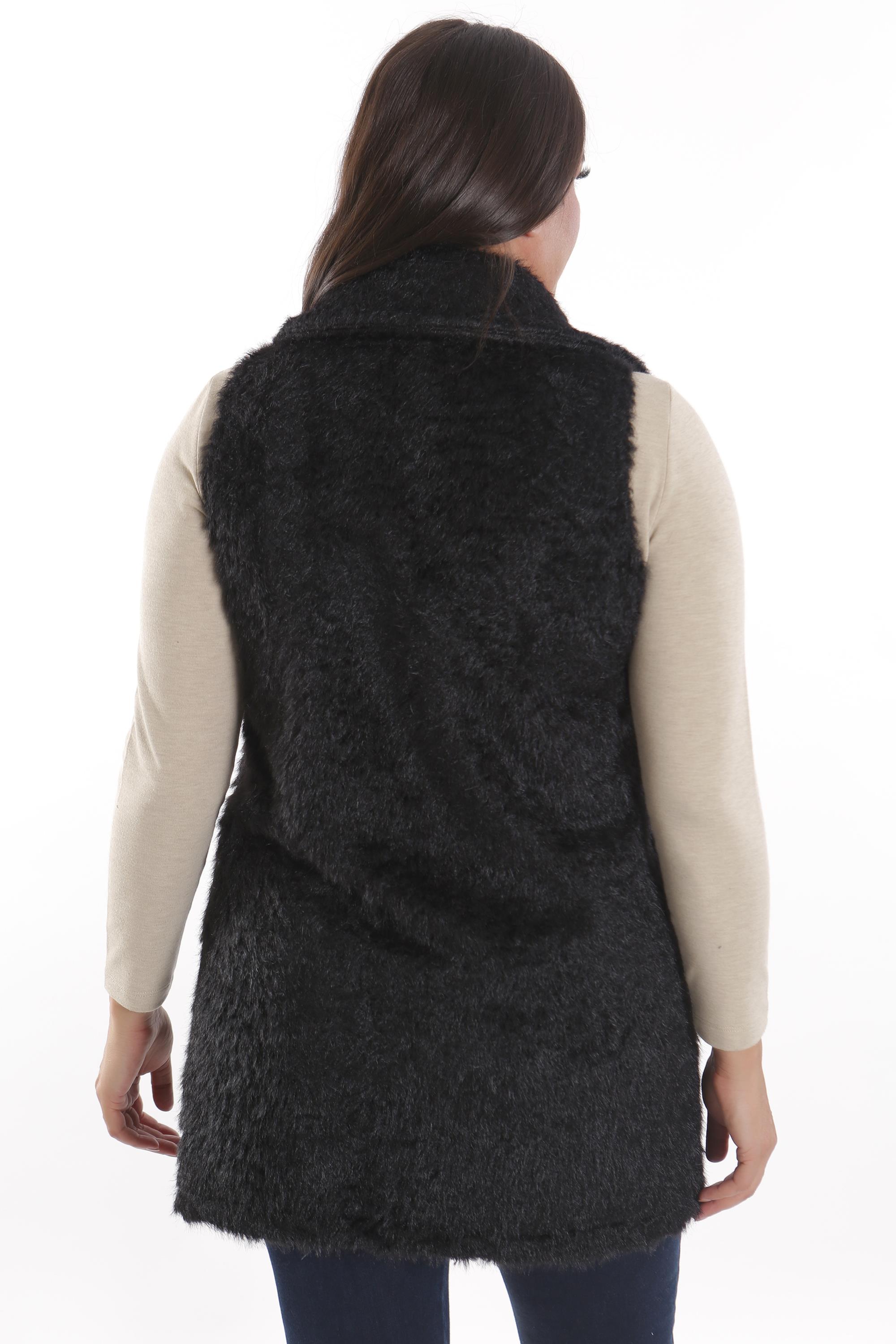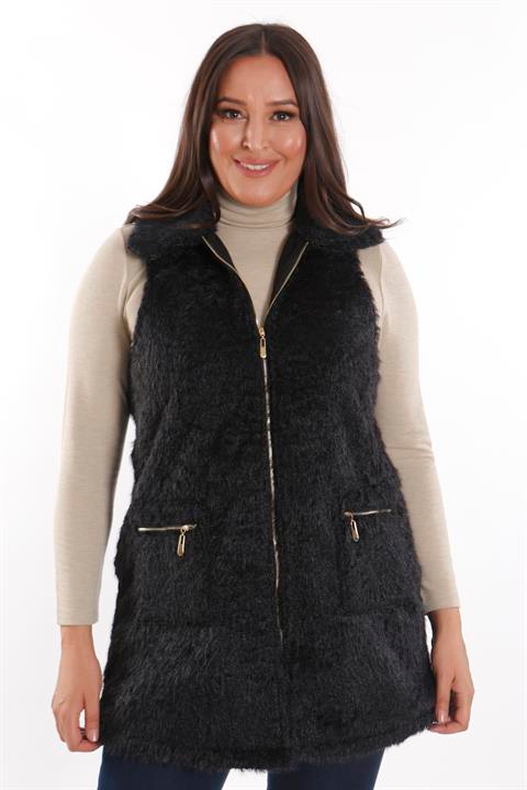 Trend42plus Büyük Beden Fermuar ve Cep Detaylı Siyah Kürk Yelek (45062)