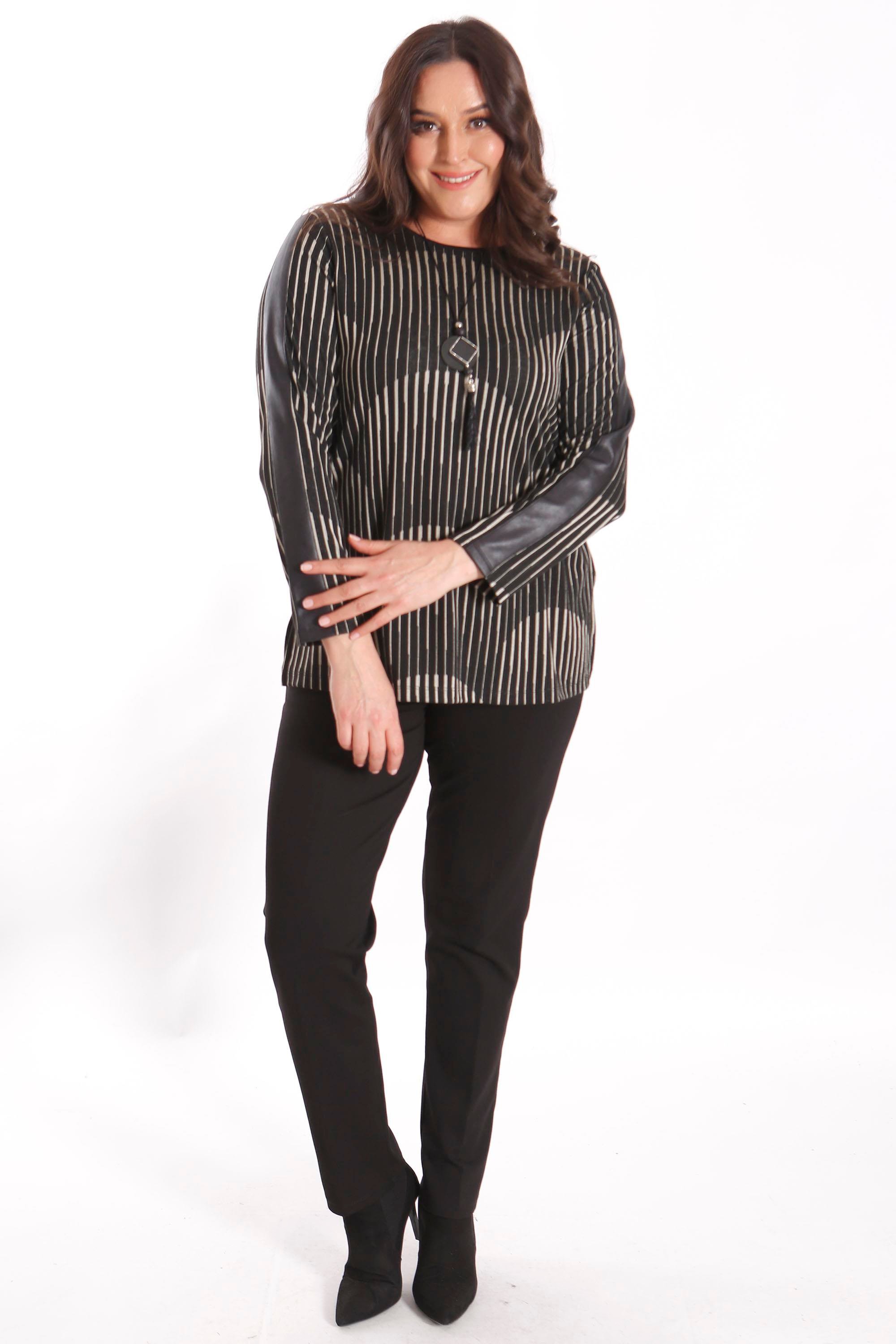 Trend42plus Büyük Beden Kollar Deri Şeritli Siyah Bluz (20682)