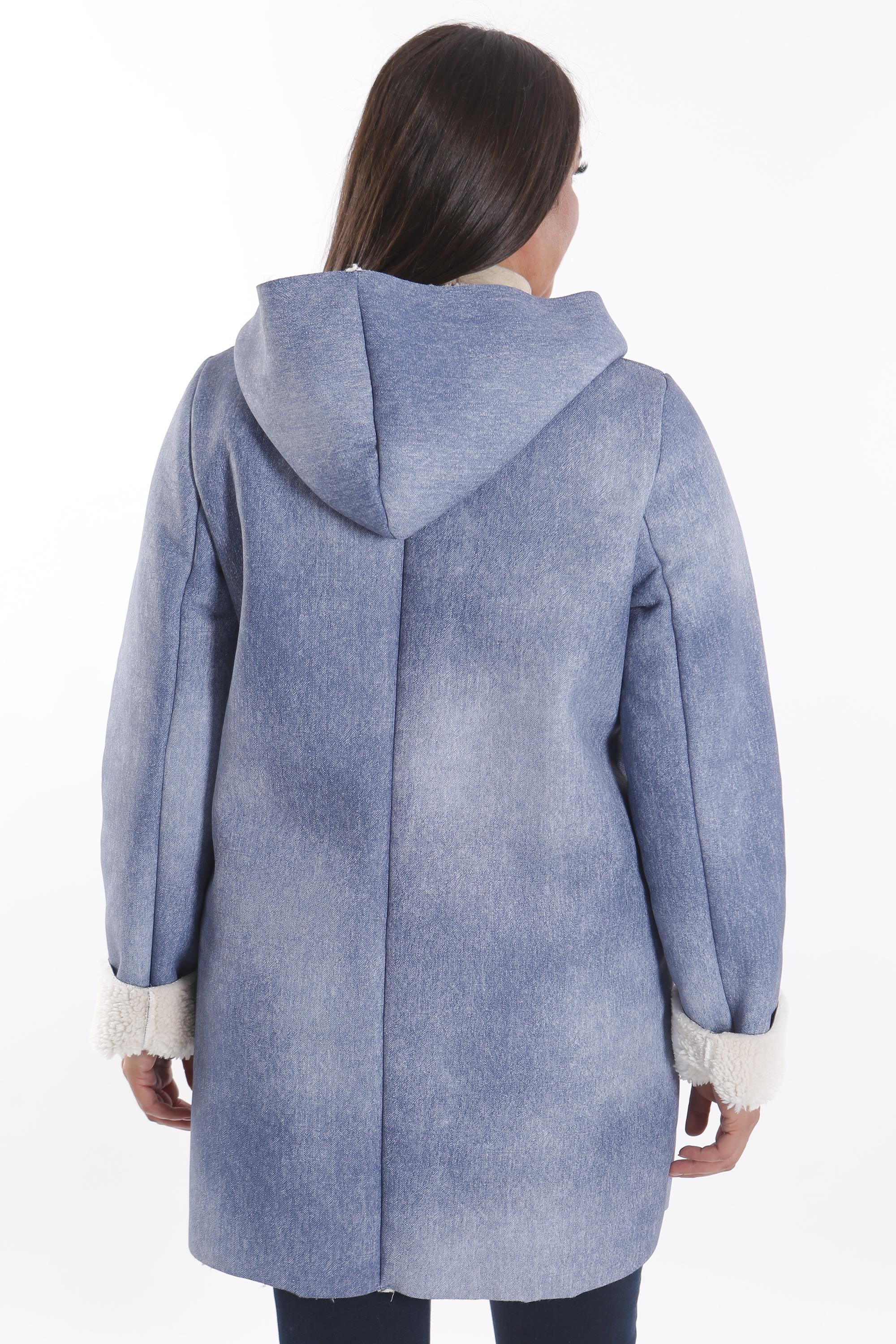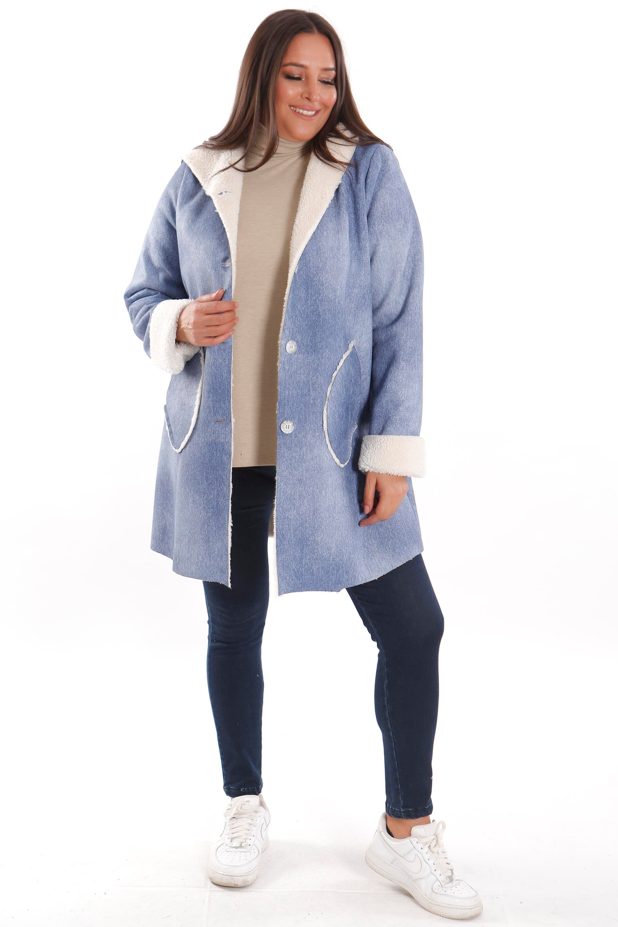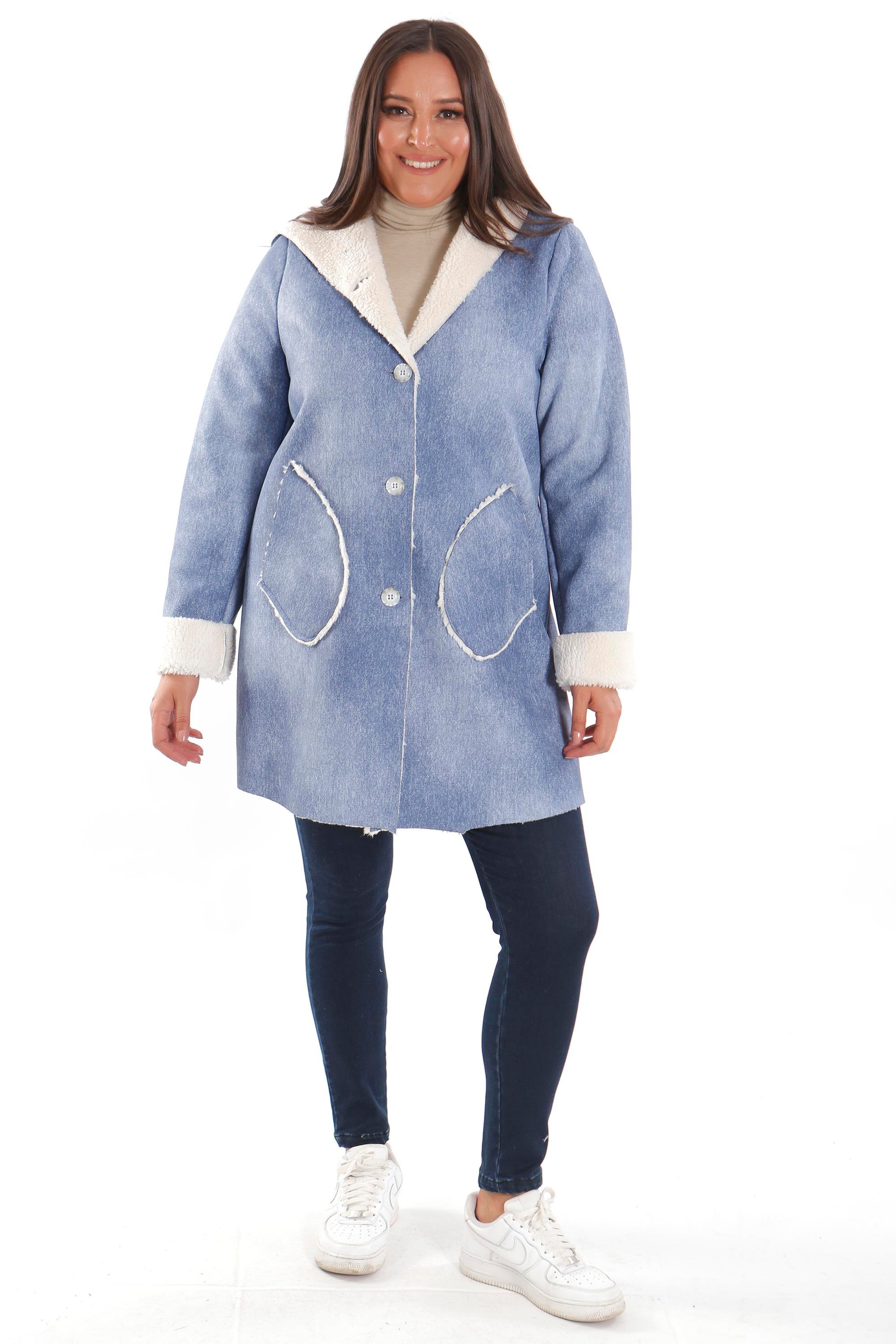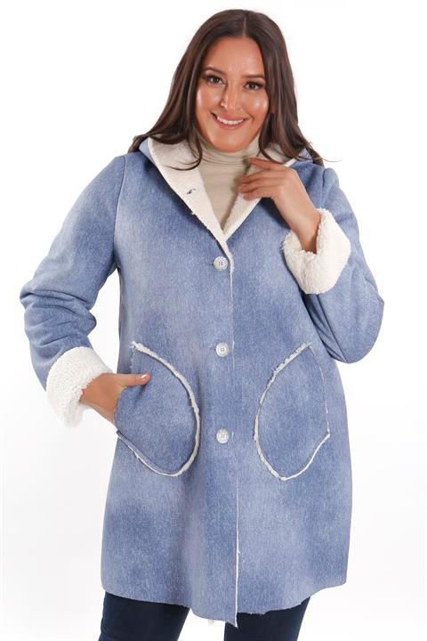 Trend42plus Büyük Beden Kot Görünümlü Kapüşon Detaylı İçi Kürklü Mavi Kaban (91544)