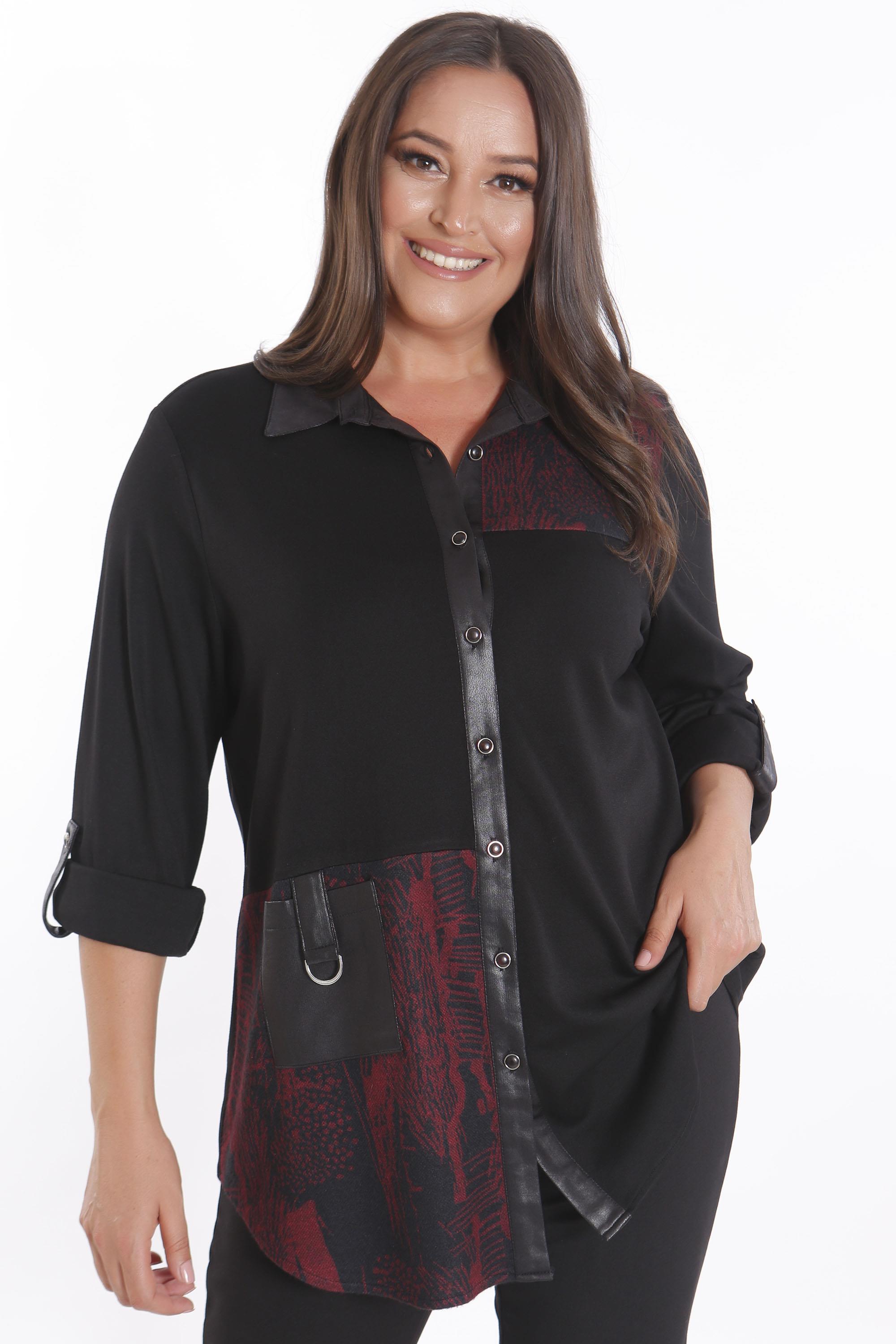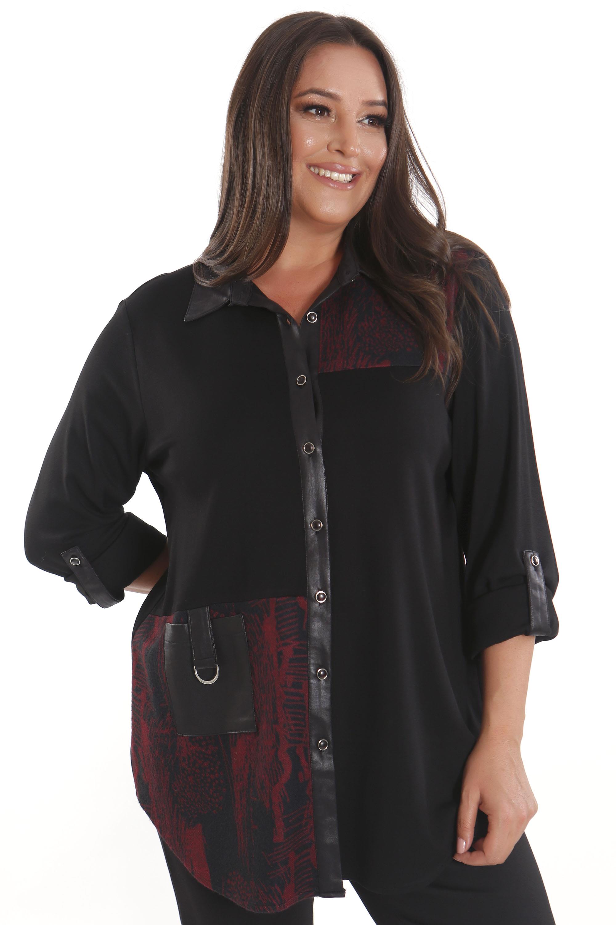 Trend42plus Büyük Beden Ön Parça ve Deri Cep Detaylı Örme Bordo Gömlek