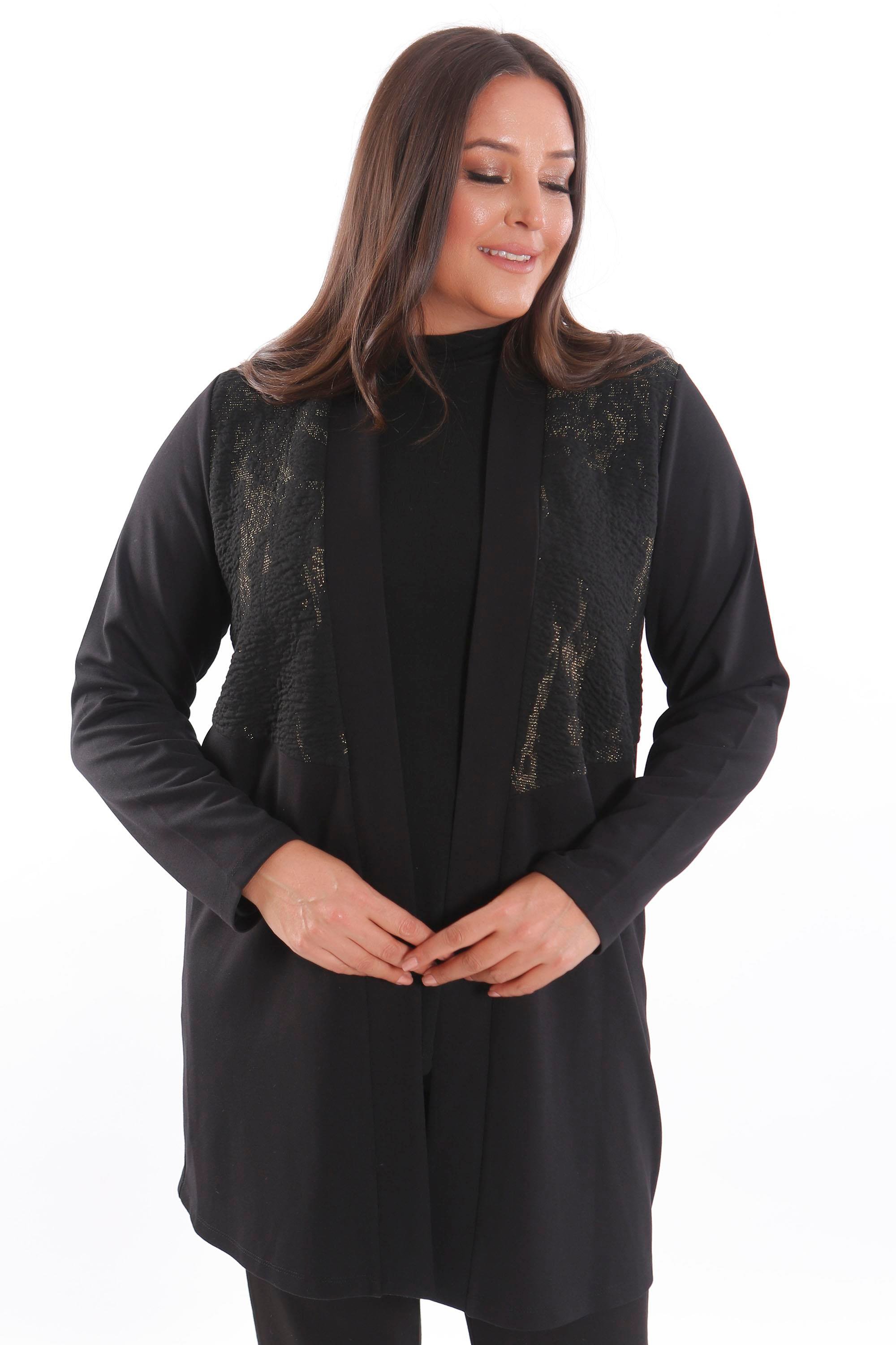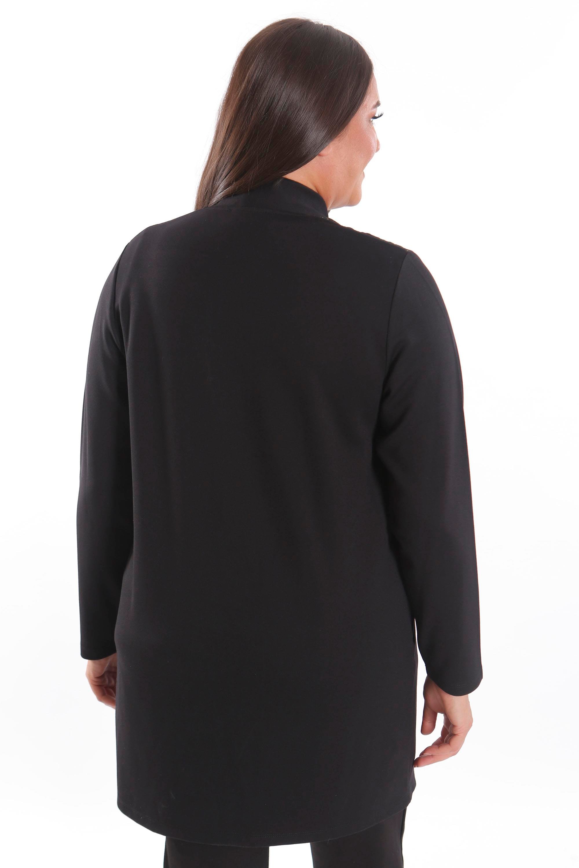 Trend42plus Büyük Beden Ön Sim Parça Kumaş Detaylı Uzun Siyah Hırka