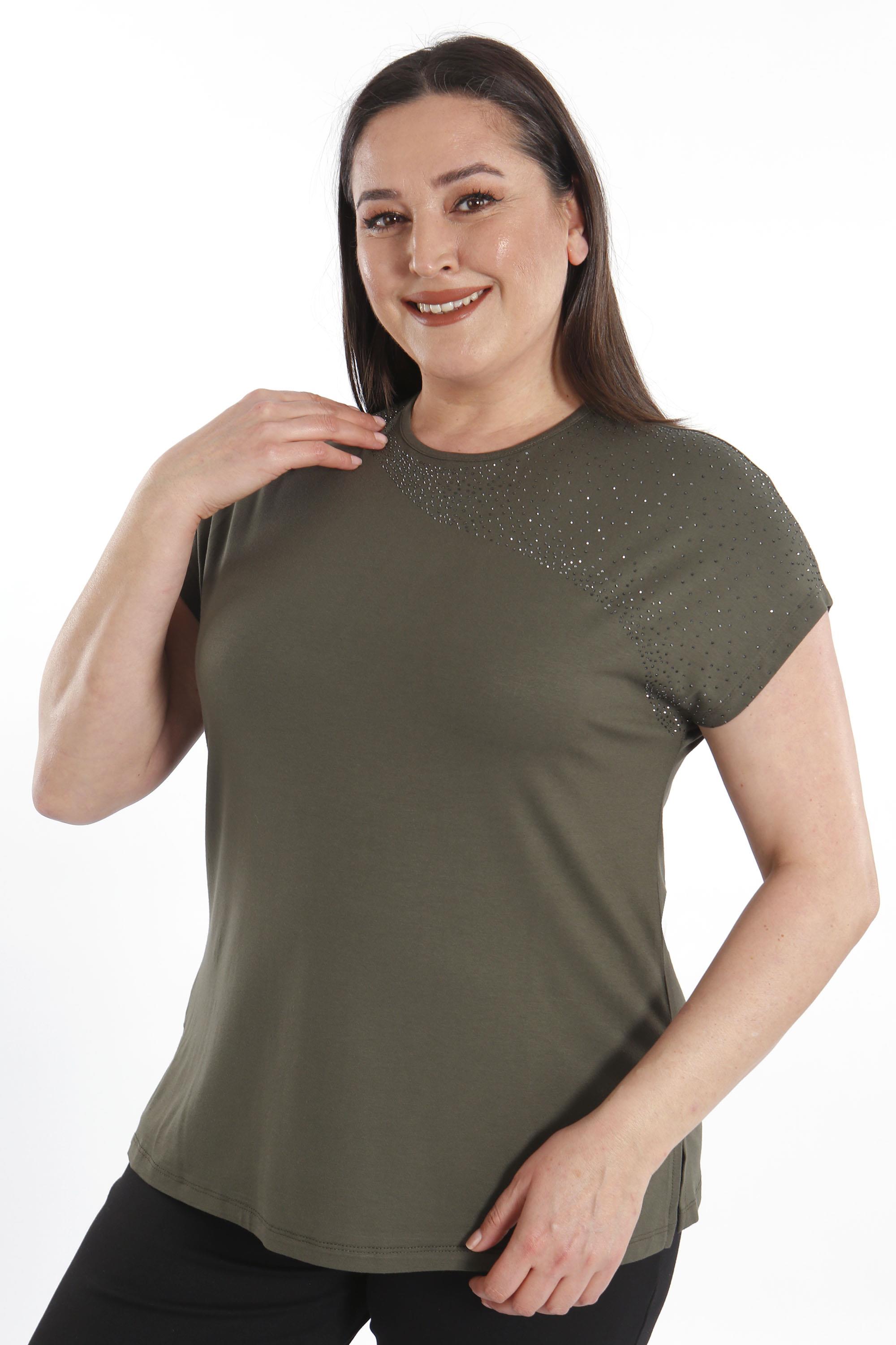 Trend42plus Omuz Kısmı Crystal taşlı Kısa Kol Büyük Beden Viskoz Haki Kadın T-Shirt (20664)